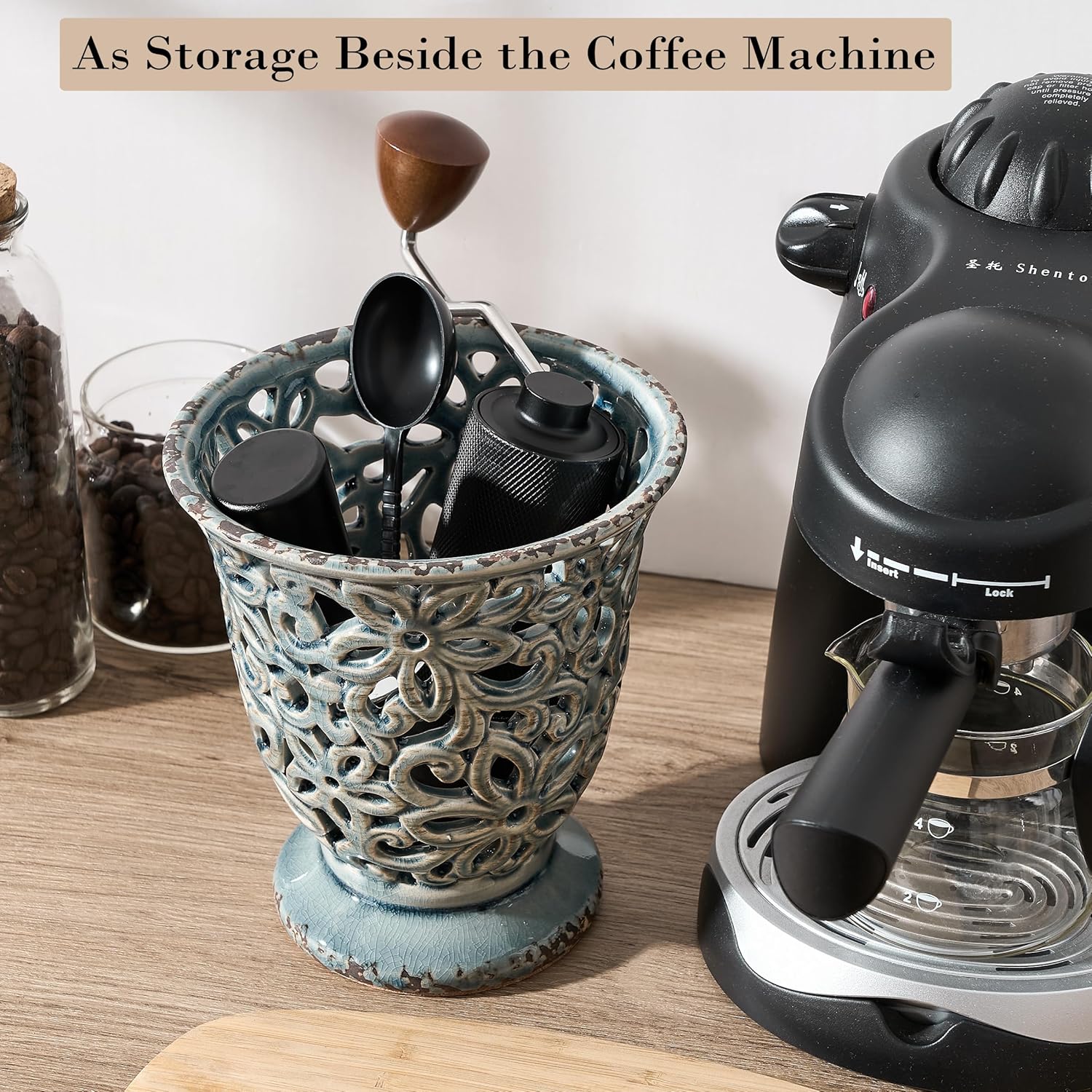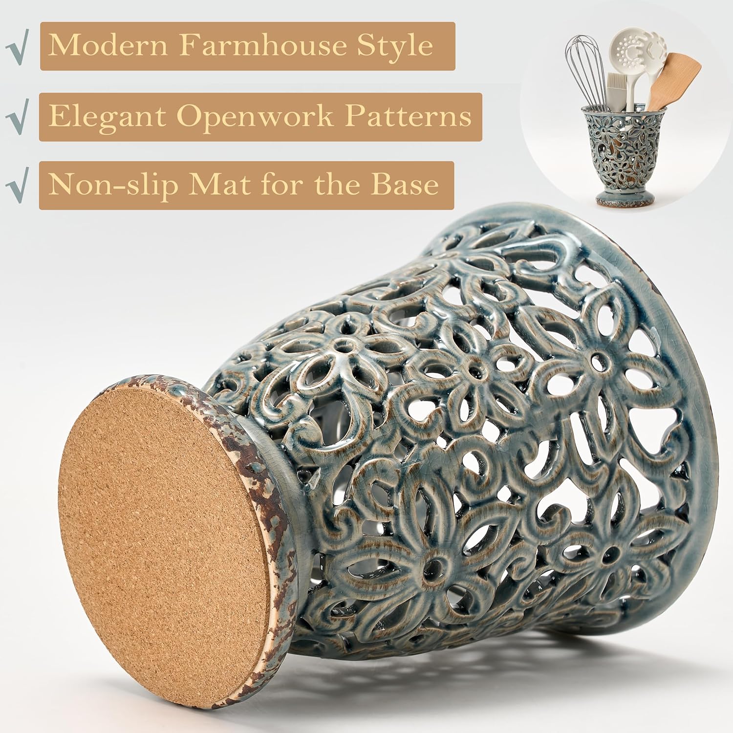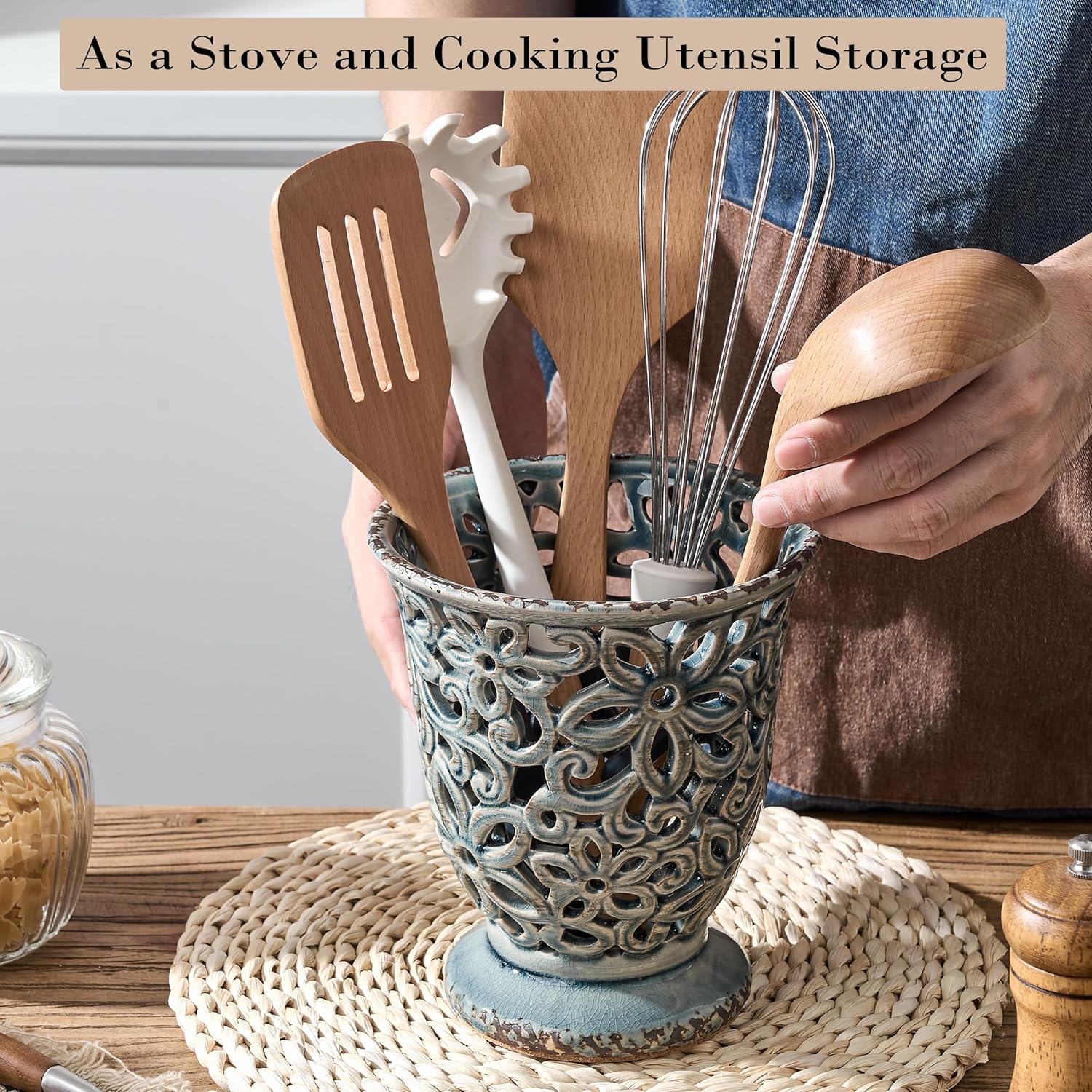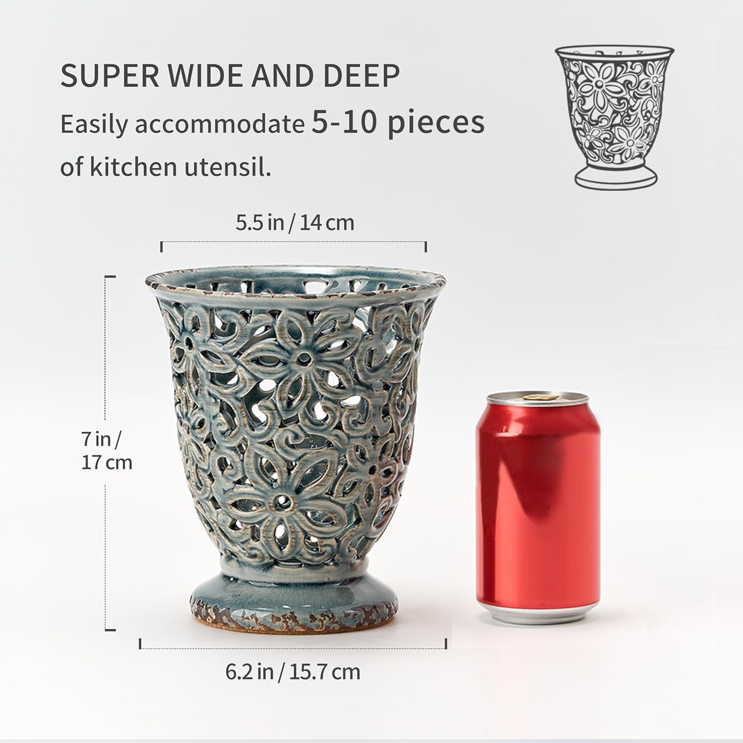 - [Durable Ceramic Craftsmanship]: Crafted from premium clay, this utensil crock features intricate carvings and professional openwork techniques. Handmade and kiln-fired with glaze, its delicate openwork patterns and vibrant, ever-changing glaze create a stunning visual effect.