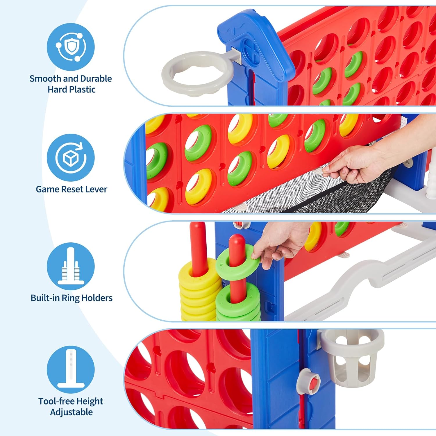 Giant 4 in a Row Game,Adjustable Height Board Jumbo 4-in-a-Row Game with Quick-Release Slider,Mini Basketball,Golf & Ring Toss Set for Family Party, Outdoor & Indoor