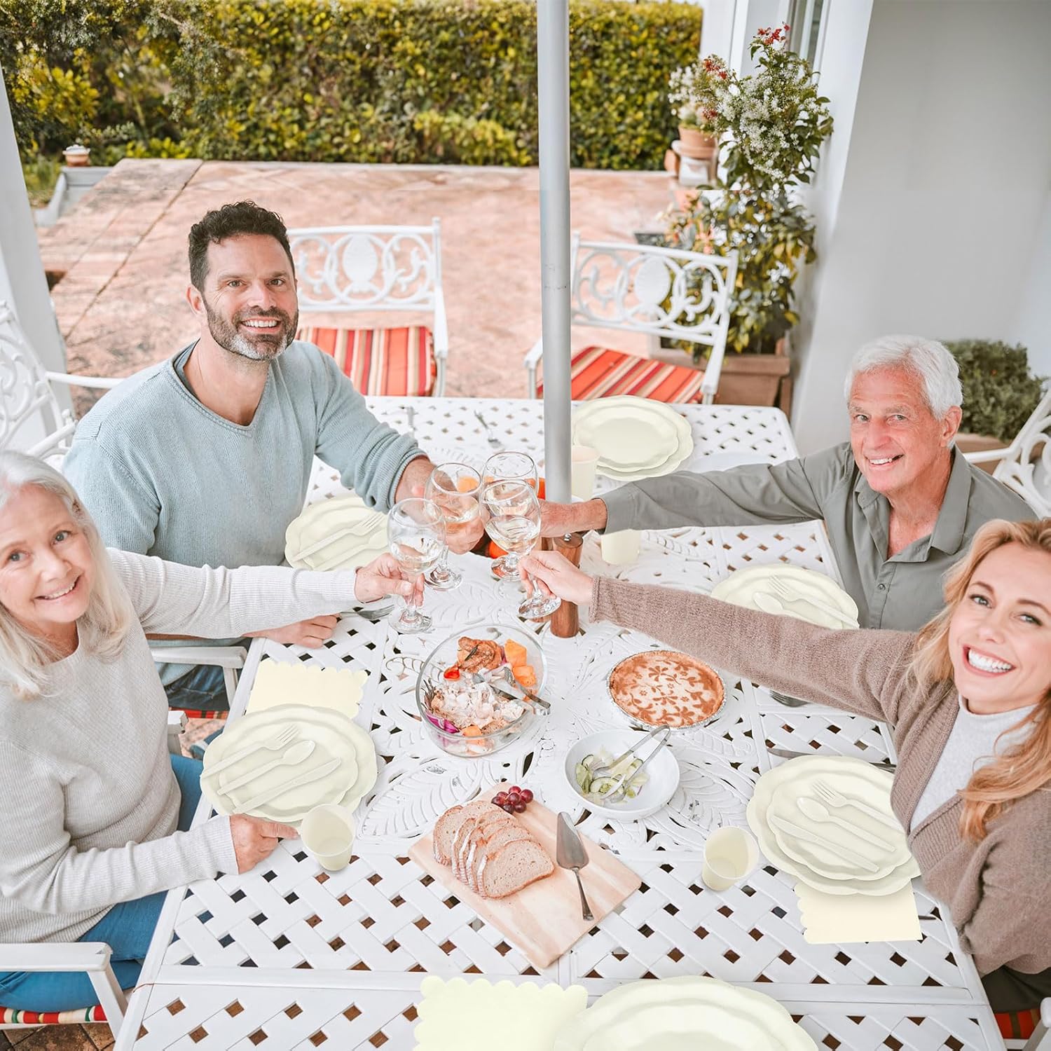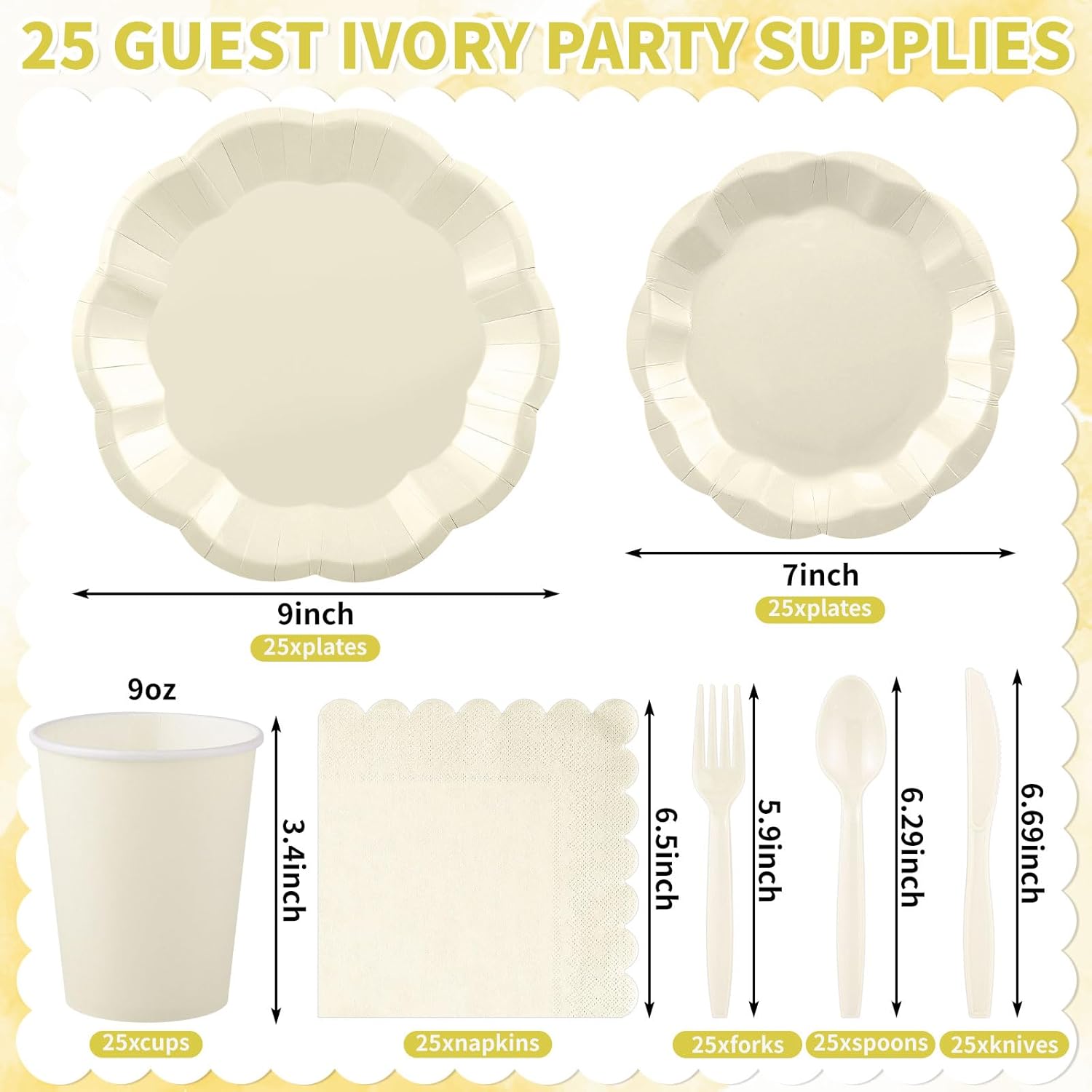 - 【Serves 25 Guests】You will receive 25 x 9 inch Ivory plates, 25 x 7 inch Ivory plates, 25 x paper cups, 25 x napkins, 25 x knives, 25 x forks, 25 x spoons, multiple quantity sets can meet your party needs and serve multiple guests