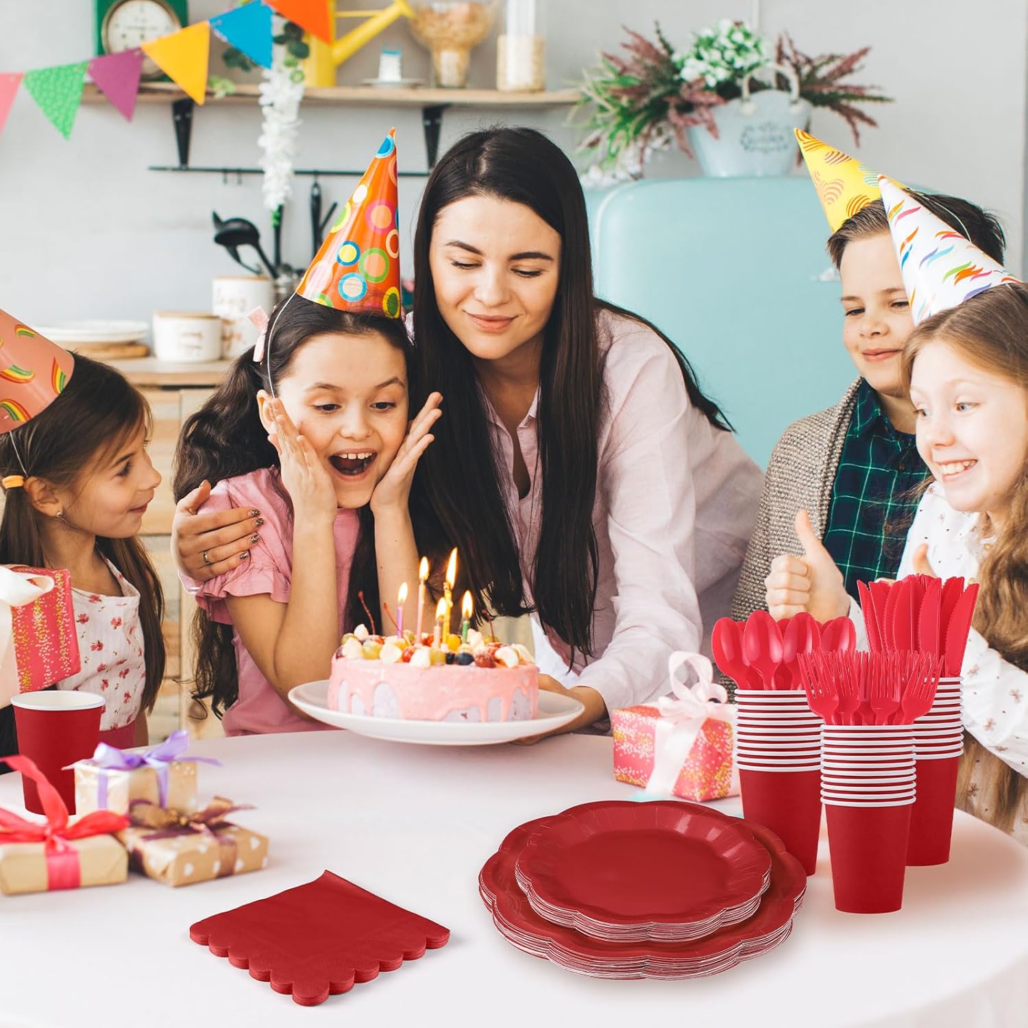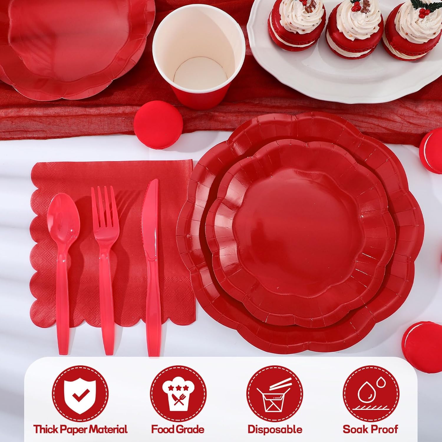 175 Pcs Christmas Red Plates and Napkins Set, 25 Guest Red Party Supplies Include Scalloped Plate Paper Napkin Cup Fork Knives Disposable Plastic Cutlery for Christmas Wedding Holiday Birthday Party