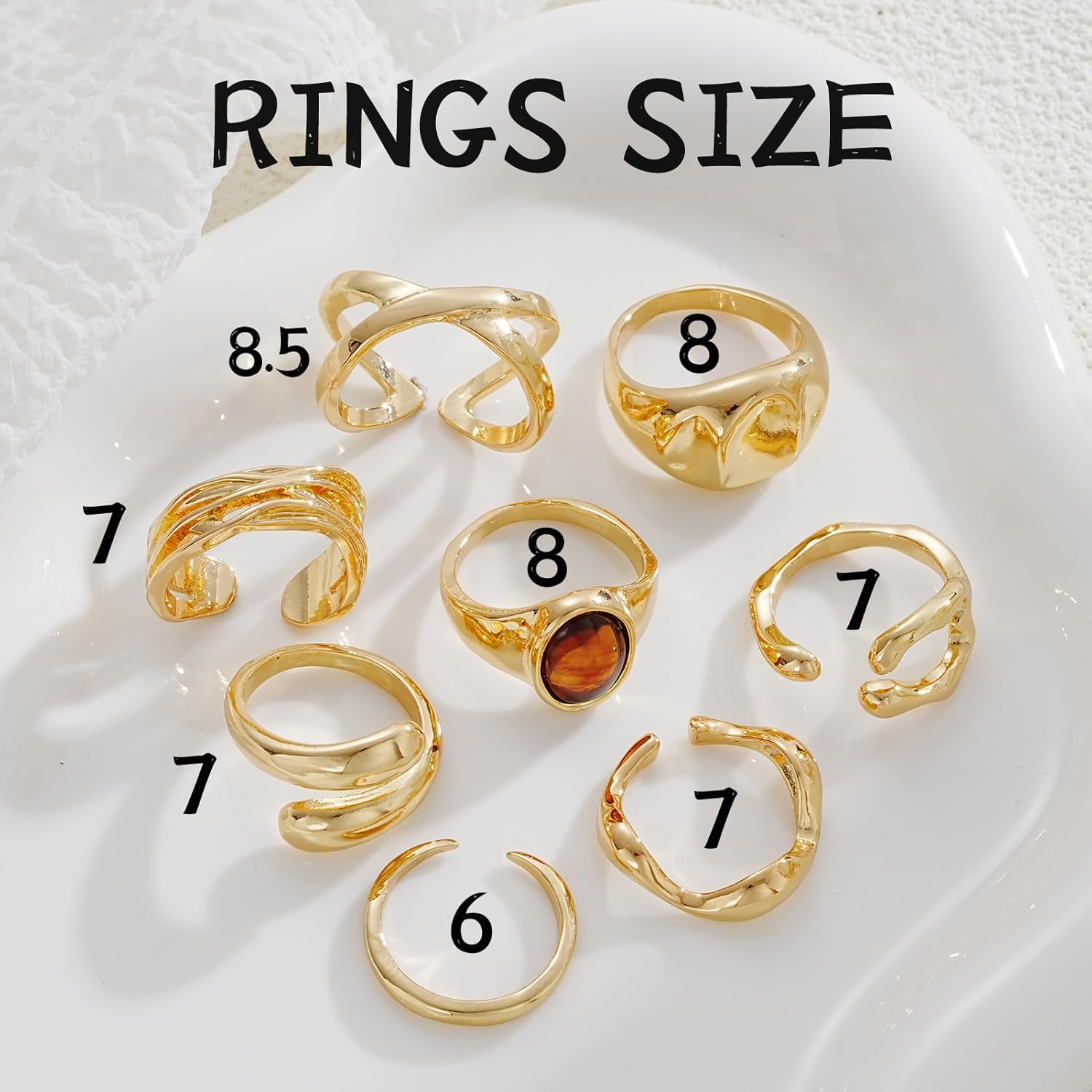 - Gold Band Rings: You will get a 12 pieces gold ring set. Those rings come in many different styles, include heart, signet, square, tubular,chunky and twist ring. There are enough quantity to meet your different outfits, match a best look for yourself!