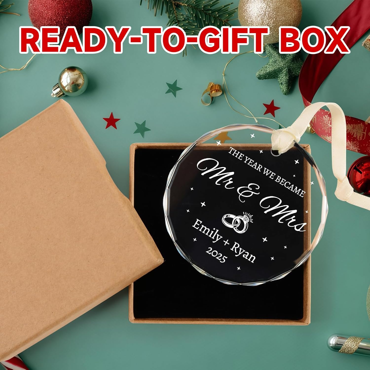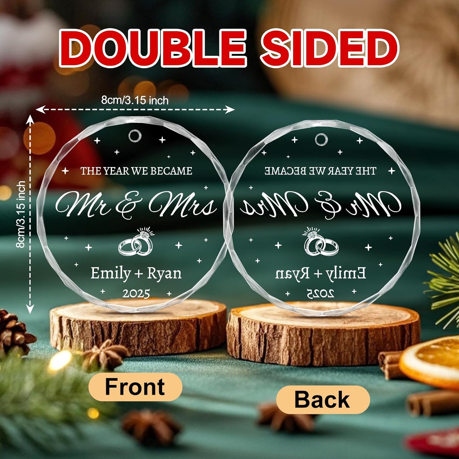 - CUSTOM WEDDING GIFTS FOR COUPLES: Click "Customize Now" to start personalize your own ornament special with name, date etc. Wish the happy couple a lifetime of joy with this darling acrylic ornament. Featuring "The Year We Became Mr & Mrs" in a beautifully subtle way, it's like a little sparkle of happiness to remind them of their special "I do" each and every year. Suitable for wedding ornament, wedding keepsake ornament, Mr and Mrs ornament, couple ornaments, first married ornament, just married ornaments