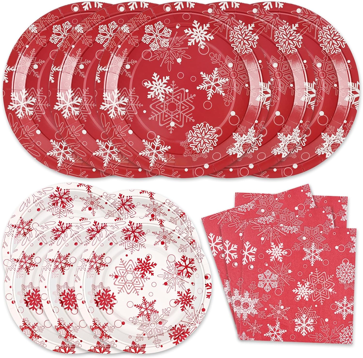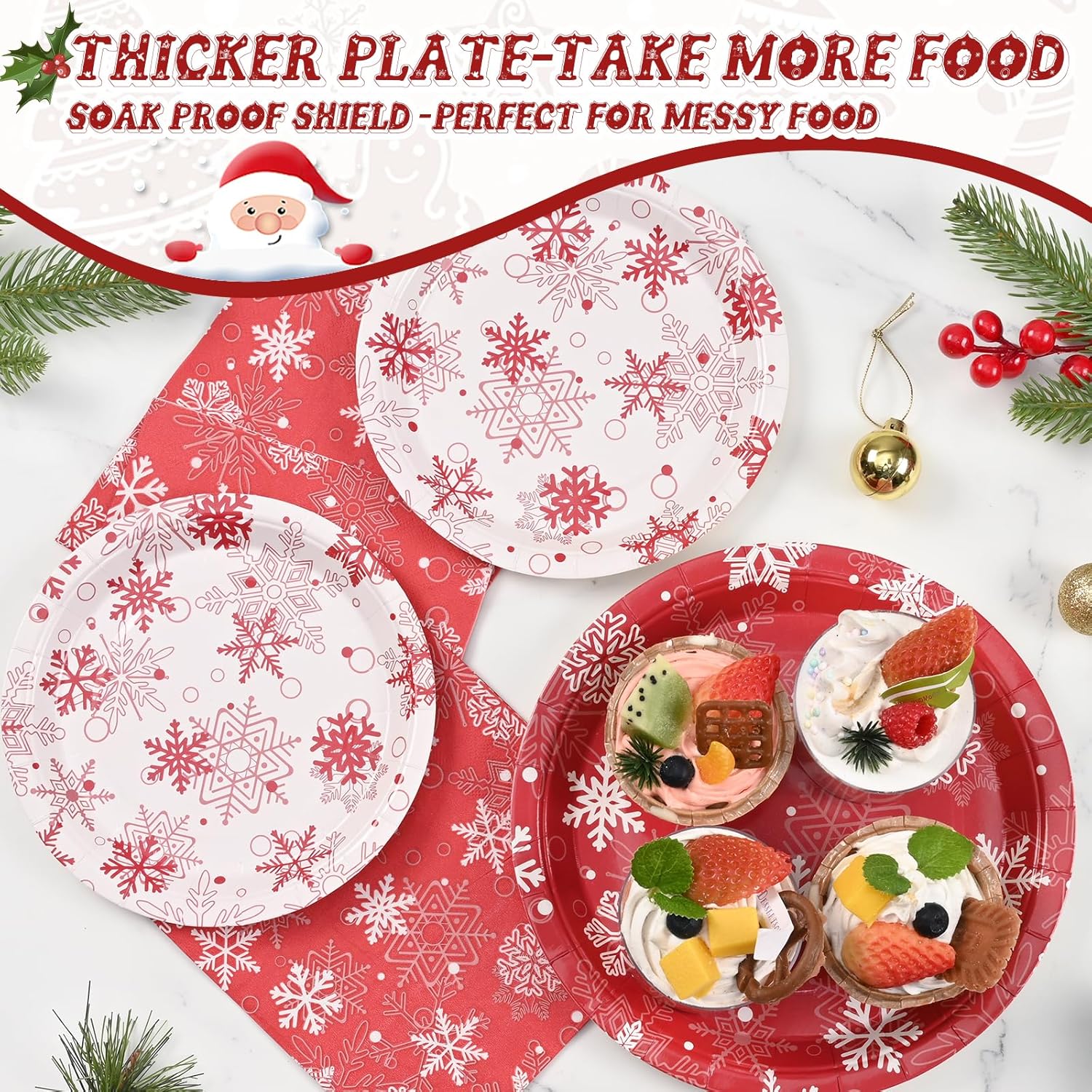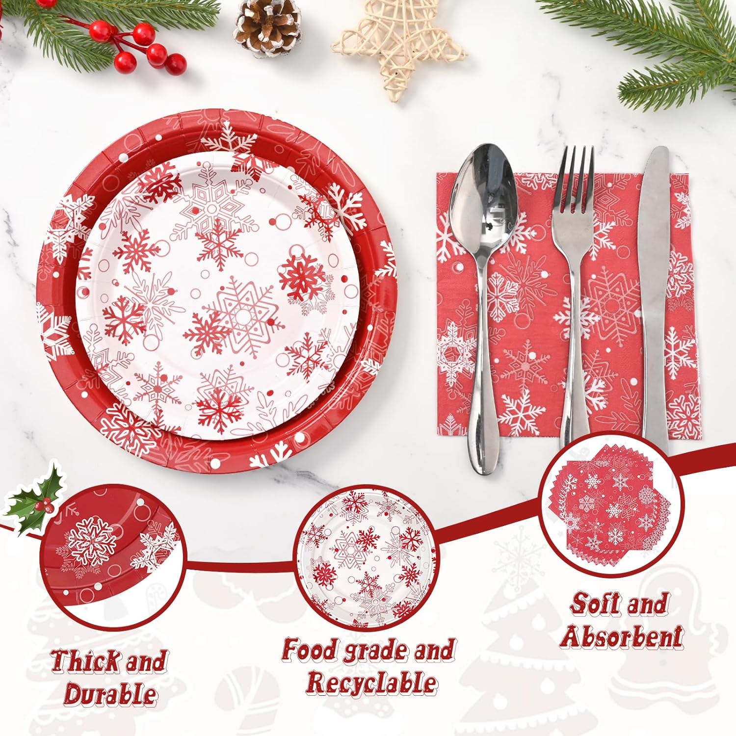 - ELEGANT RED & WHITE SNOWFLAKE DESIGN: Our snowflake paper plates set steals the show: dinner plates feature a bold red base with crisp white snowflakes, while dessert plates reverse to a bright white base with red snowflakes. Paired with napkins, they turn any table into a central Christmas decoration-perfect for adding joyful atmosphere to Christmas party.