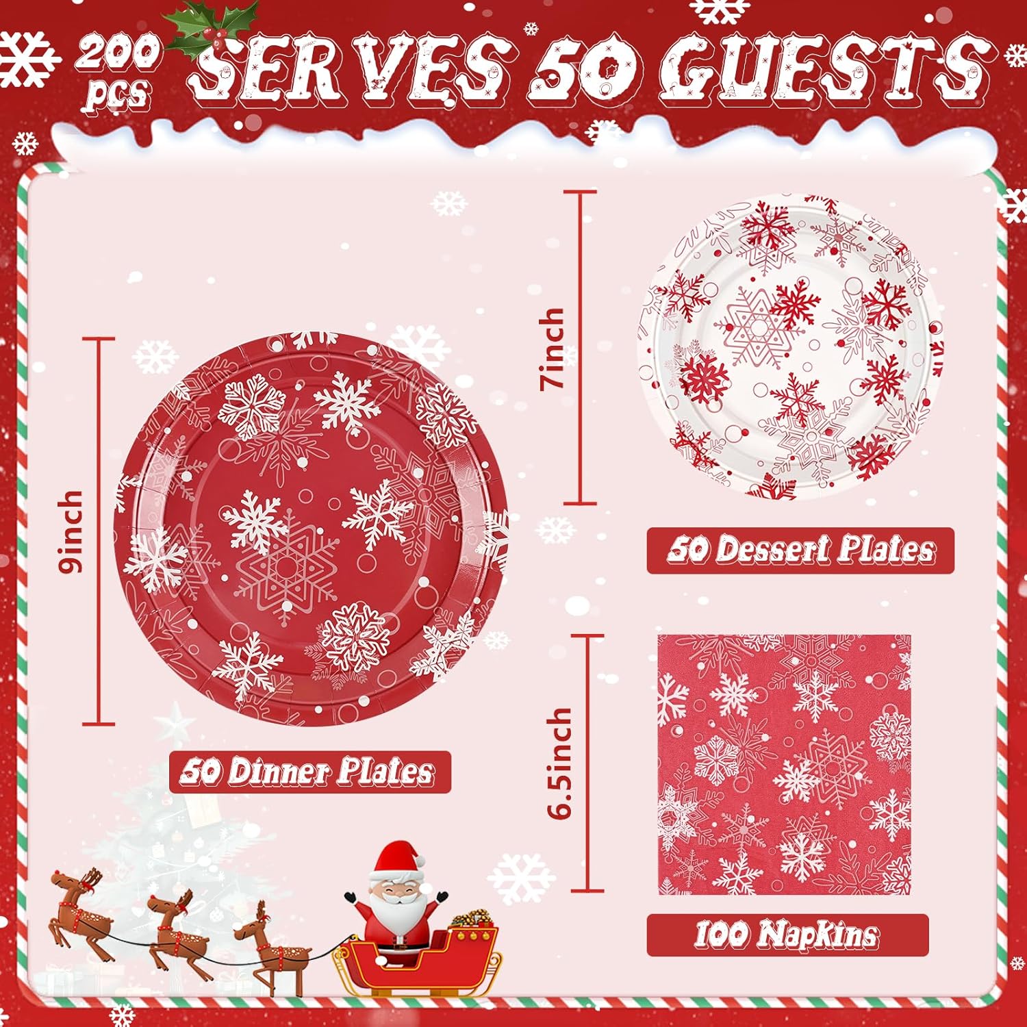 Homlouue 200Pcs Christmas Plates and Napkins Set – Disposable Snowflake Dinnerware with 50 Dinner & 50 Dessert Plate, Christmas Paper Plates and Napkins for Holiday Parties Decor