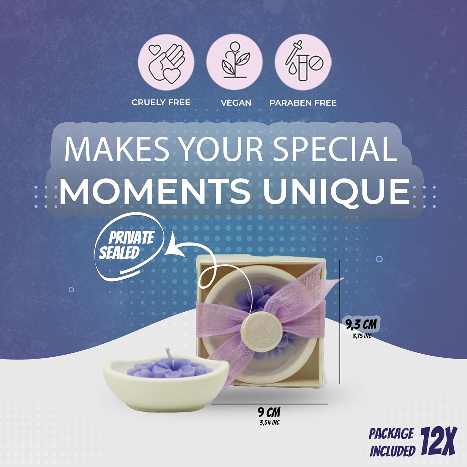 - Ready for Gifting: Each of the six candles is individually packaged in a chic white box, tastefully decorated with a ribbon and a delicate plastic violet figure, making them perfect ready-to-give favors.