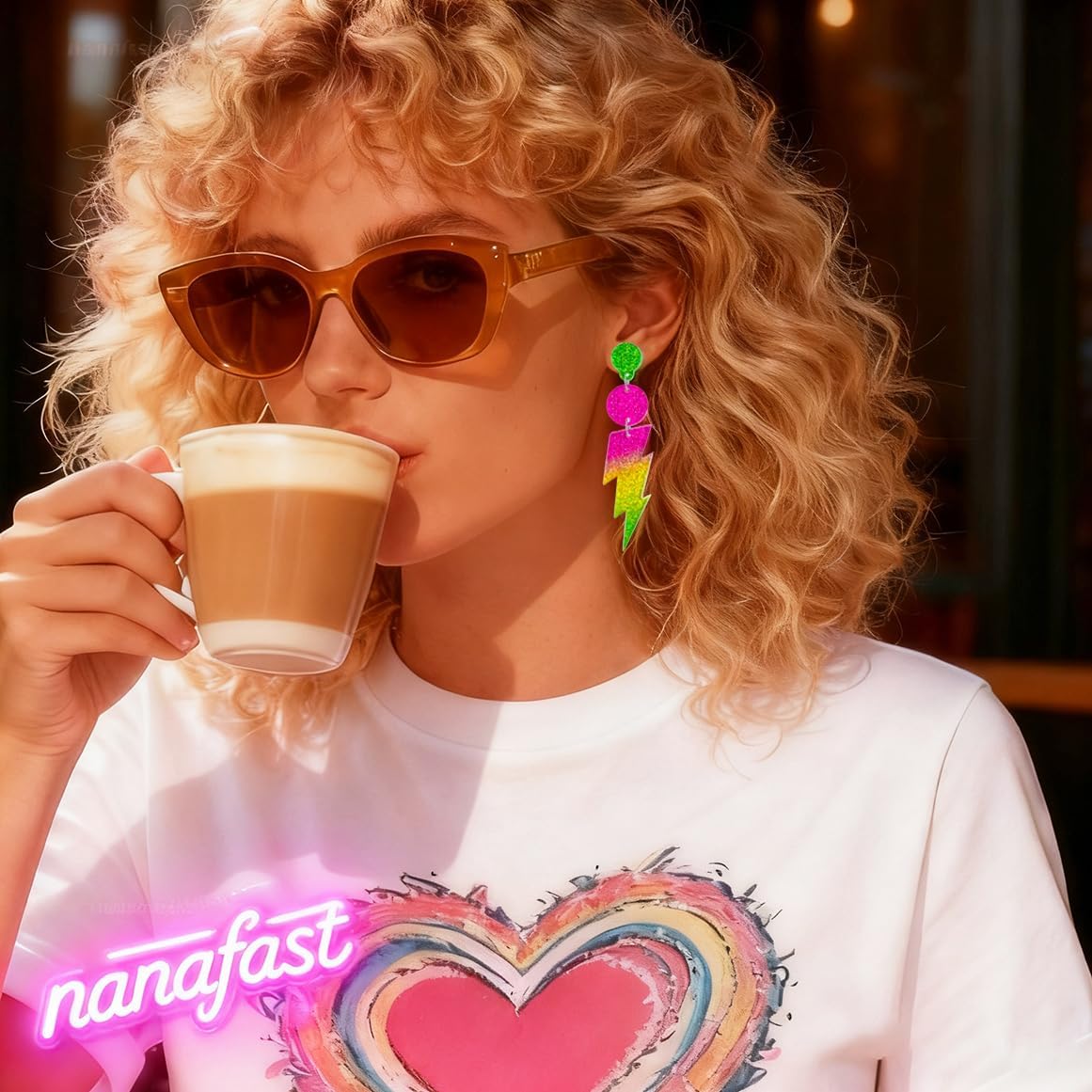 Nanafast 80S Neon Earrings Lightning Bolt Dangle Earrings for Women, 80s Accessories for Women Colorful Gradient Neon Jewelry