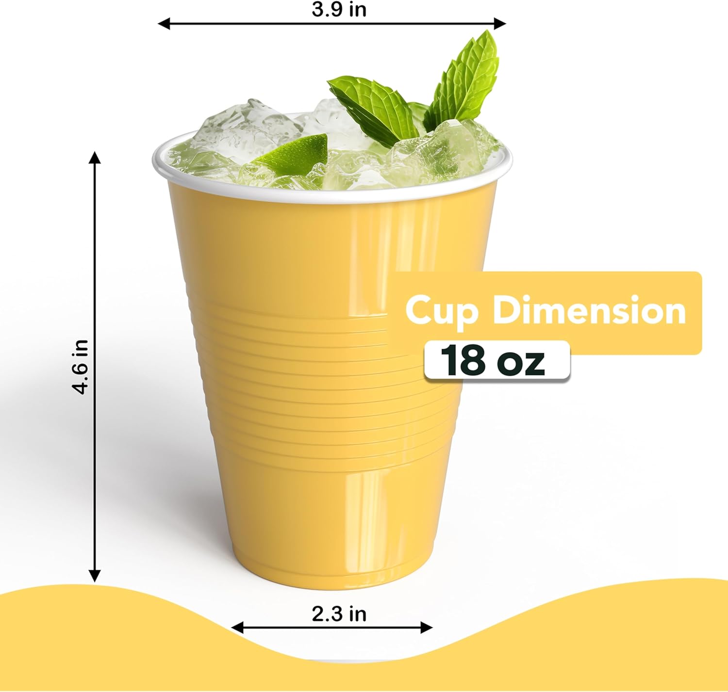 - Quality: We had you in mind when making our yellow plastic cups 18 oz. Crafted with sturdy materials, these large plastic cups can withstand heavy drinks, making them ideal for adult parties and celebrations. With colorful plastic cups available, you can add a pop of color to any gathering.